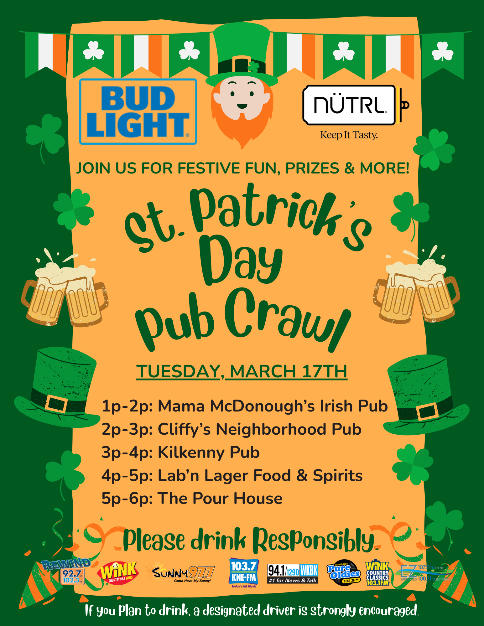 Wear some green and come celebrate the luck of the Irish on Tuesday, March 17th for a good ol’ Irish Pub Crawl! *