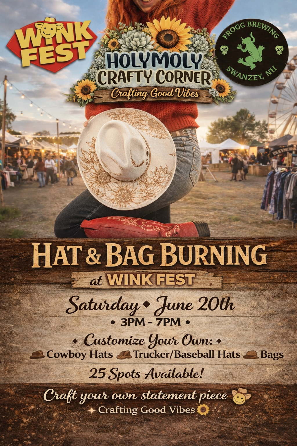 - Decorate your own cowboy hat, trucker or baseball hat, or bag with Holymoly Crafty Corner (about $60 pp- includes instruction, tools, and all materials!). Click here to reserve your spot!